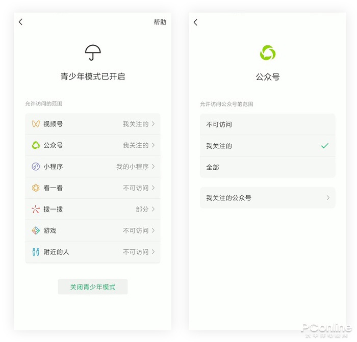 等带有娱乐性质的功能,来防止未成年人过度沉迷。所不同的是,微信允许使用者自定义部分模块的屏蔽程度。如在 “公众号”、“视频号”中,便提供了