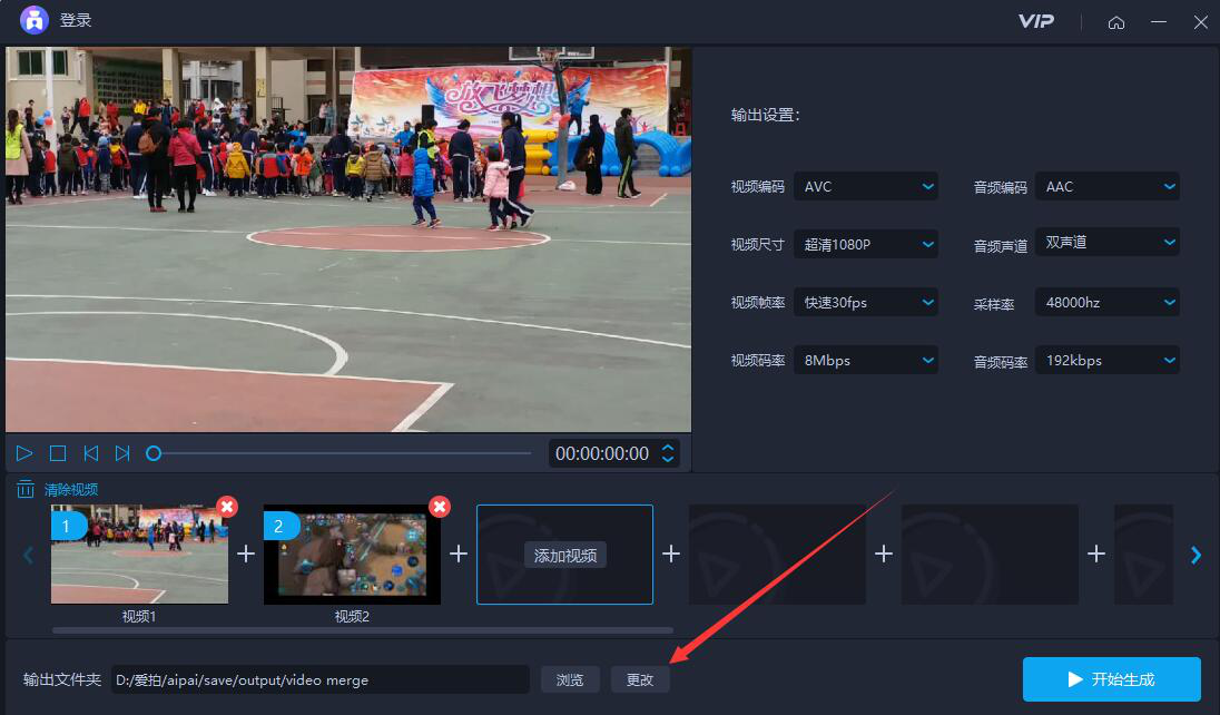 9、接下来,我们点击界面右下方的“开始生成”按钮,爱拍便开始执行视频合并的命令。
