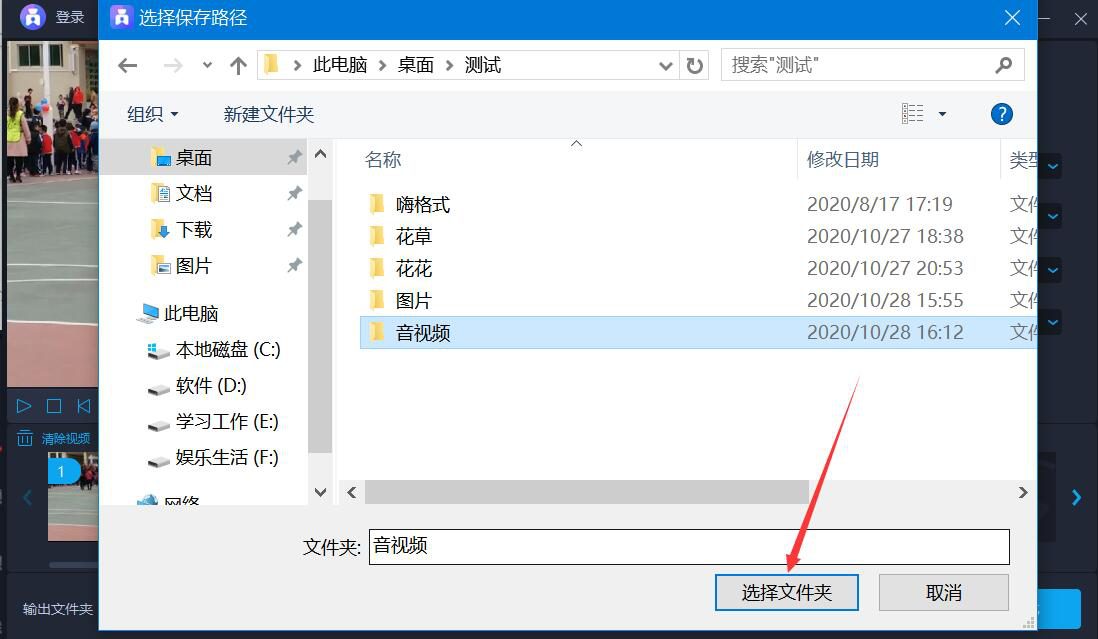 8、在弹出的窗口中,单击选中爱拍合并视频后的输出文件夹,并点击“选择文件夹”按钮。