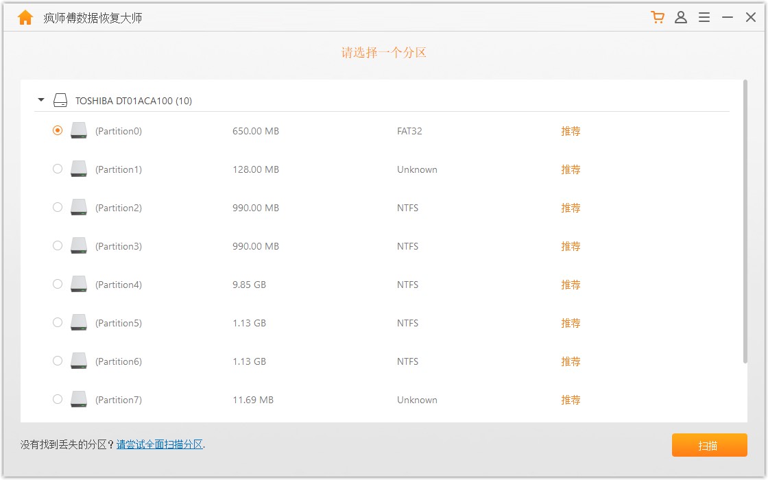 软件立即扫描驱动器,扫描完成,选择需要恢复的分区,然后点击【扫描】,如果疯师傅数据恢复大师没有找到丢失的分区,点击底部的【 请尝试全面扫描分区】进行查找,
