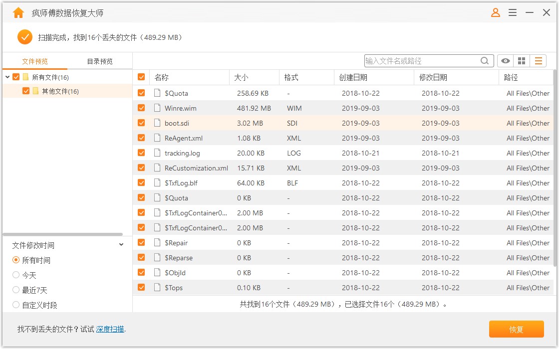 扫描完成,软件会根据文件类型进行罗列展示,勾选文件,点击【恢复】,等待数据恢复。注意,找回的数据暂时不要保存到之前的分区,分区重建之后,再将数据保存到电脑。