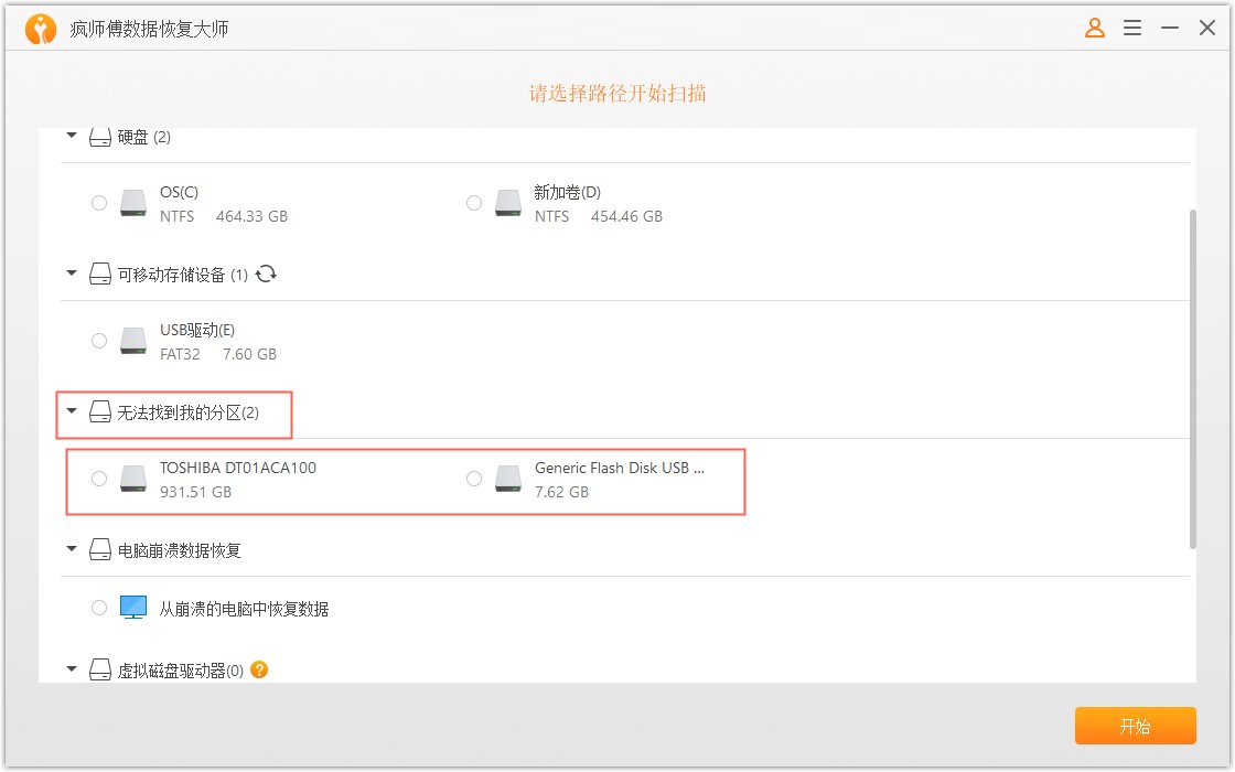 下载安装疯师傅数据恢复大师,打开软件,进入界面,如图,点击【无法找到我的分区】,选择任意一个驱动,点击【开始】,