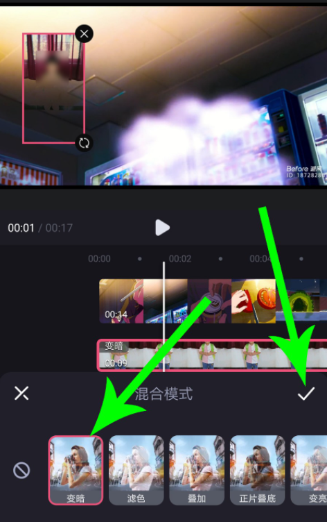 打开混合模式界面,点选【变暗】,让画中画与背景视频融合到一起,然后点击【√】,