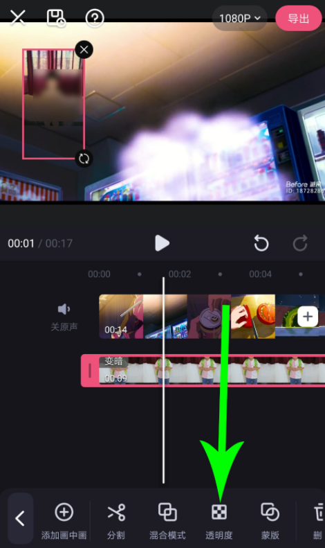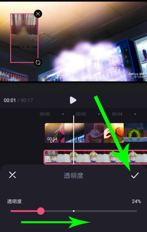 回到视频剪辑窗口,点击【透明度】,向右拖动滑块增加透明度,让画中画与背景视频自然融合,最后点击【√】,保存设置即可。