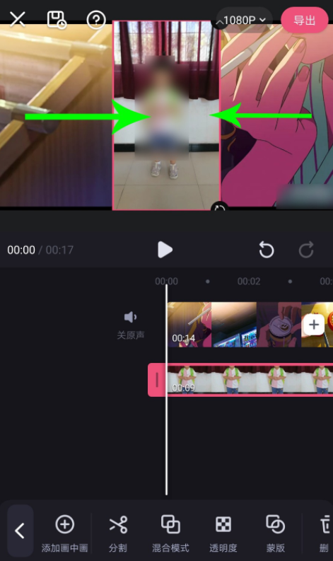 导入画中画视频,使用两根手指同时按住视频,然后向画面中心位置拖动,可以缩小视频画面,