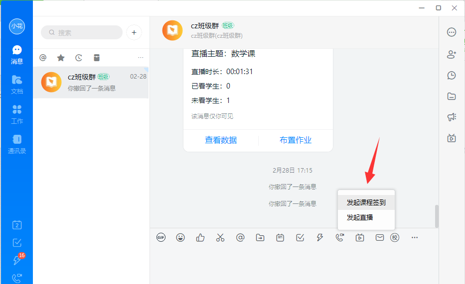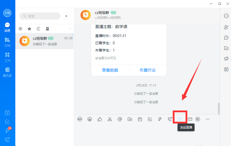 在电脑中打开钉钉软件,进入面板,在消息页面选择一个群组,选择班级群,然后在群聊窗口点击【发起直播】,