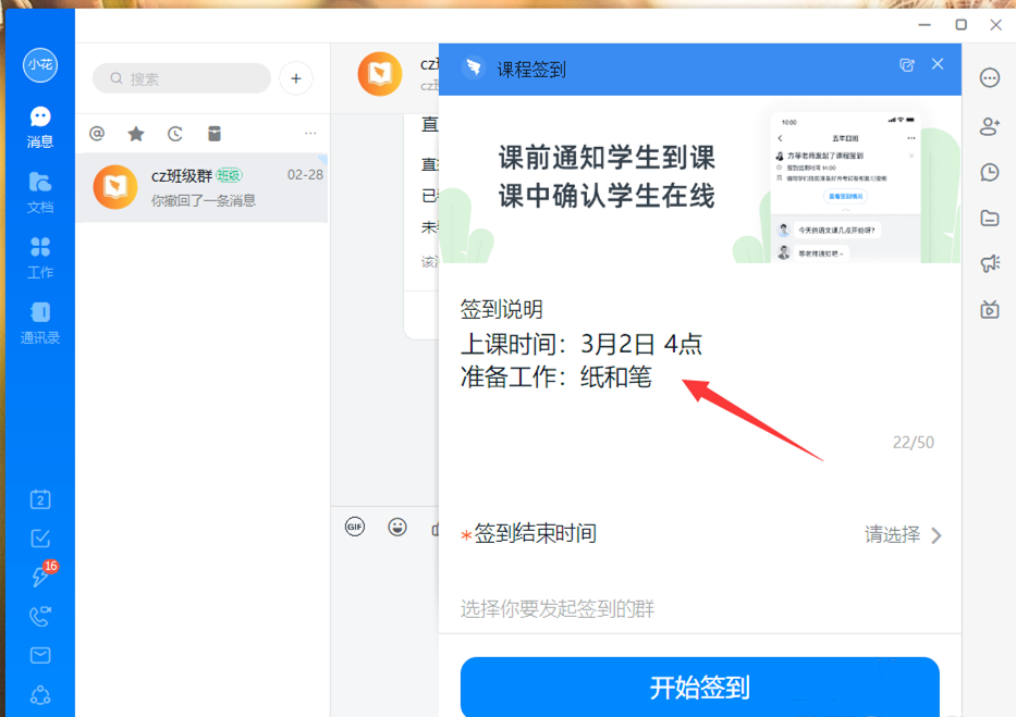 弹出课程签到的对话框,首先输入签到说明,设置签到结束时间,