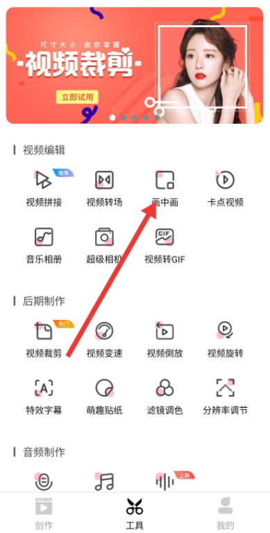 在手机中打开爱剪辑APP,进入创作界面,点击下方【工具】,选择【视频编辑】——【画中画】,