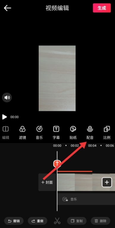 点击【录制】,即可自己录制视频配音,然后点击【声效】,设置声音效果,最后点击【生成】即可。