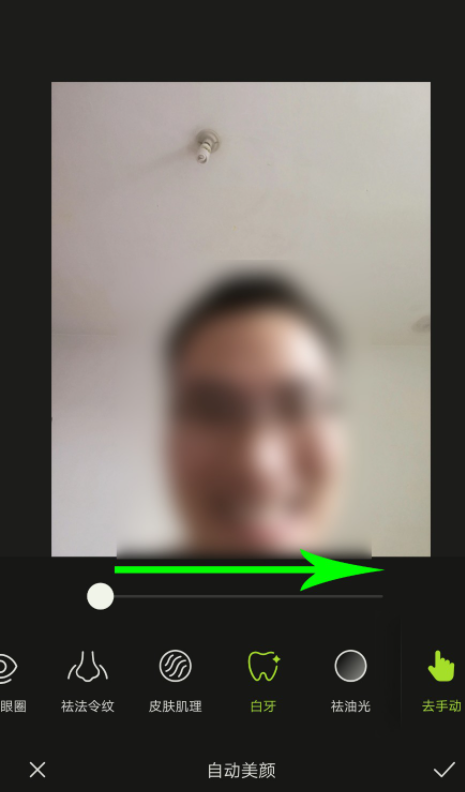 跳转至以下界面,如图,按住白色滑块向右拖动,直到牙齿变白,