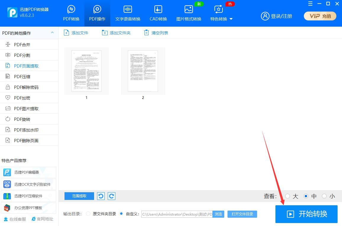 7、之后,我们点击界面右下方的“开始转换”按钮,迅捷PDF转换器便开始根据我们刚才设置的页面范围来提取PDF文件中的页面。
