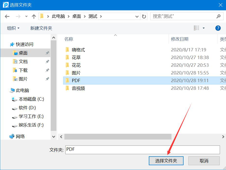 6、我们继续在弹出的窗口中,选择PDF文件提取页面后的保存路径,点击“选择文件夹”按钮。