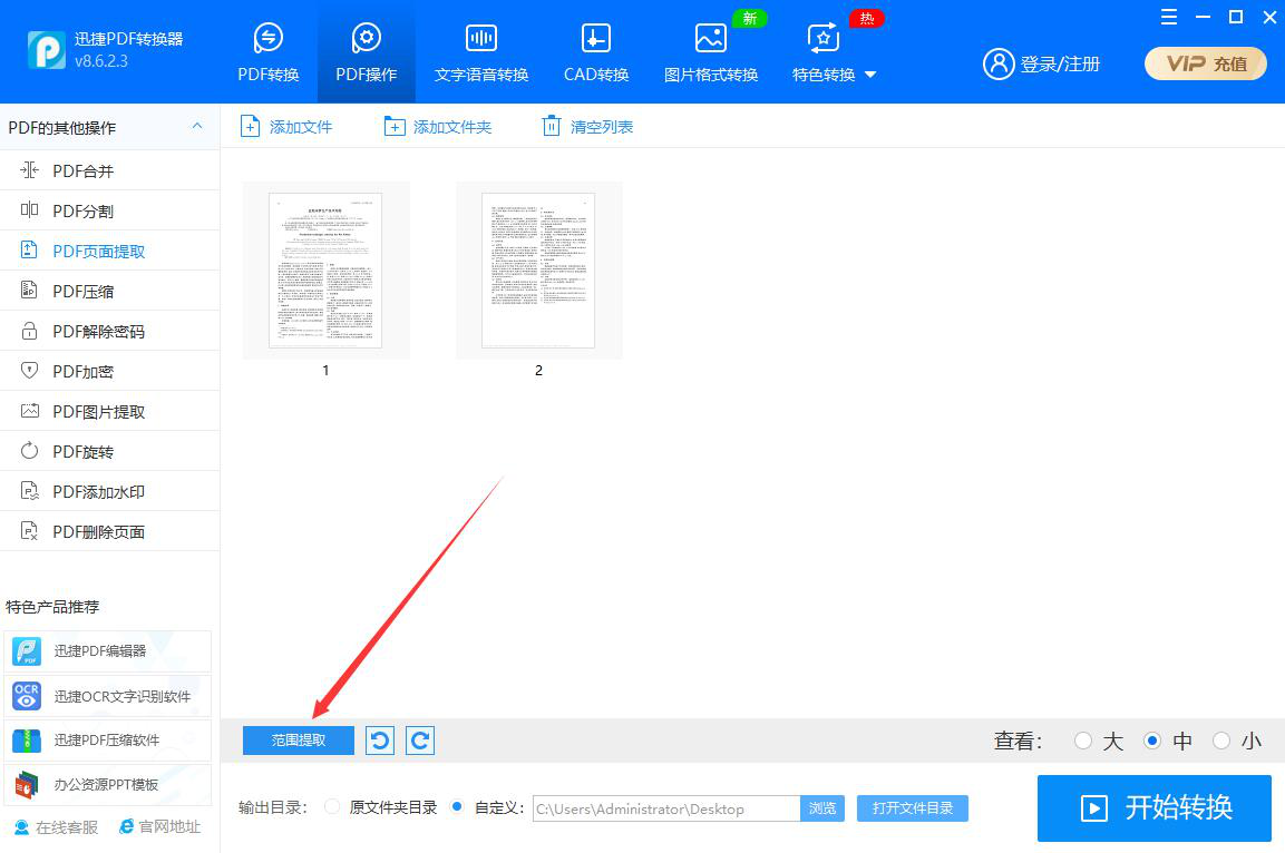 3、然后,在迅捷PDF转换器的PDF页面提取界面中,点击“范围提取”按钮。