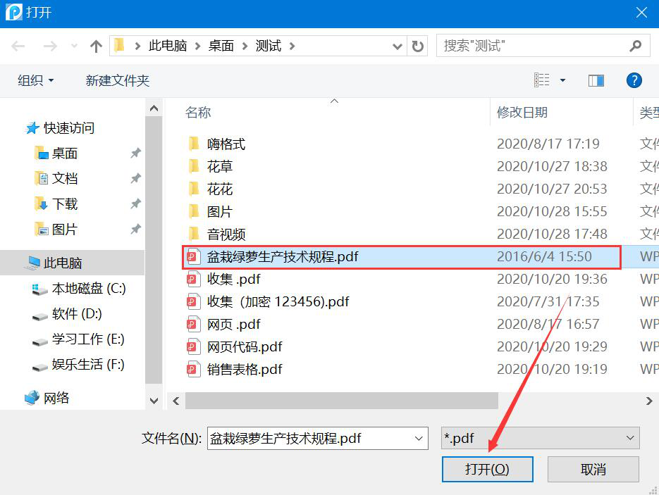 2、在弹出的窗口中,将需要提取页面的PDF文件选中,并点击“打开”按钮,将它导入迅捷PDF转换器。