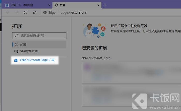 2、跳转至扩展设置页面后,点击左侧的【获取Microsoft Edge扩展】,也可以点击这里进入: