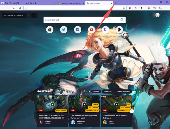 7、最后,开启英雄联盟插件后,点击edge浏览器的【+】添加标签按钮,即可查看英雄联盟主题标签效果啦;