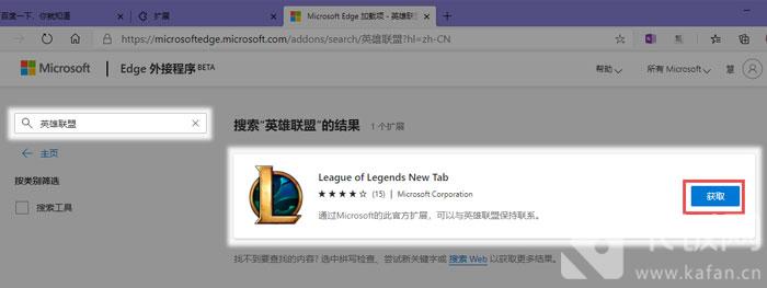 4、输入【英雄联盟】,或者直接搜索【League of Legends New Tab】,搜索出来之后,点击【获取】;