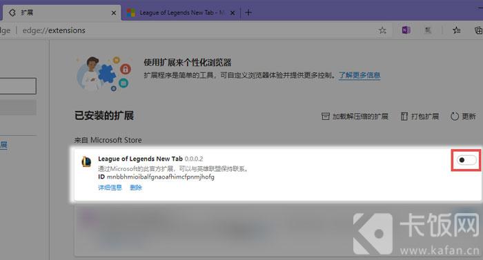 6、之后我们只需要等待添加完成,返回【扩展】页面,即可查看到添加好的英雄联盟主题,点击右侧的滑块,开启该插件;