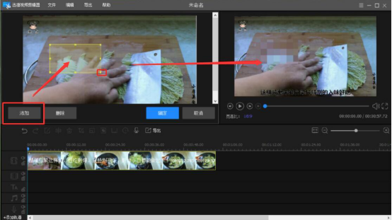 6.此时,迅捷视频剪辑器便会在界面上方展示马赛克设置窗口。我们点击“添加”按钮,可以发现在左边的窗口中出现了一个黄色的选框。这个选框就是马赛克的位置。我们不仅可以调整马赛克的大小,还可以通过移动它来调整赛马克的位置。而右边的窗口则是效果的预览。