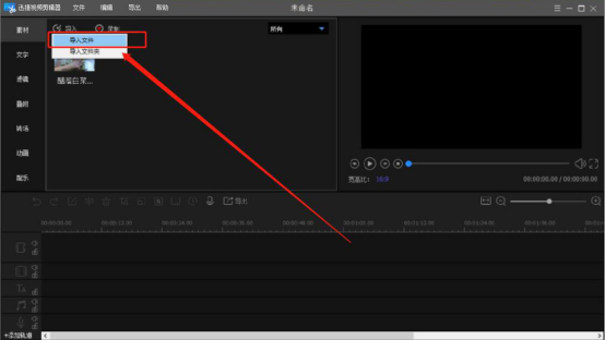 2.然后,进入迅捷视频剪辑器操作界面。点击左上方的“导入”按钮,并在其下拉选项中点击“导入文件”。