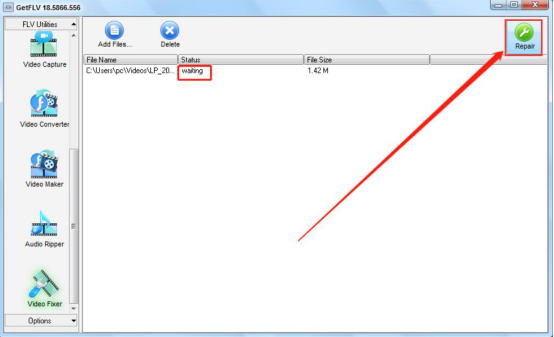 4.接着,我们点击界面右上方的“Repair”按钮,GetFLV便开始修复flv视频。