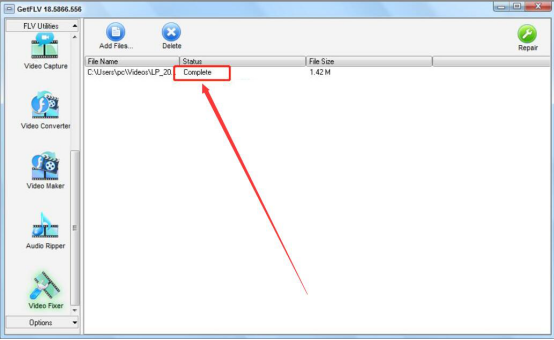 5.最后,当状态栏显示“Complete”,则说明GetFLV完成了flv视频的修复。