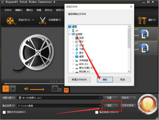 5.接着,我们点击Bigasoft Total Video Converter界面下方的“浏览”按钮,弹出浏览文件夹窗口,我们选择视频克隆后输出的路径,再点击“确定”按钮。