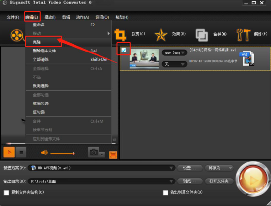 3.接下来,我们点击Bigasoft Total Video Converter的“编辑”菜单,并从其子菜单中点击“克隆”选项。