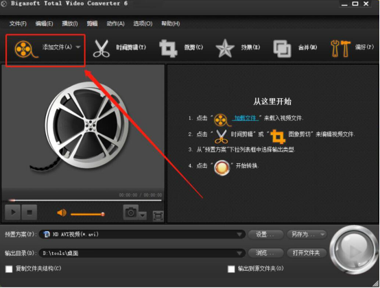 1.首先,我们打开Bigasoft Total Video Converter。点击界面左上方的“添加文件”按钮。