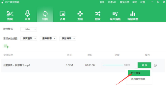 7.最后,在它弹出的选项中点击“打开目录”就能快速查看qve音频剪辑软件将MP3转M4A的音频了。