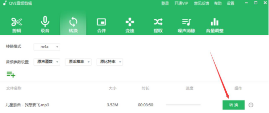 5.格式和参数都设置好了后,我们点击界面右下方的“转换”按钮。qve音频剪辑软件便开始执行MP3转M4A的命令。