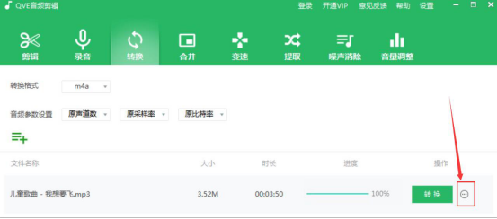 6.当进度栏中显示100%的时候,说明qve音频剪辑软件完成MP3转M4A,我们点击如下图的按钮。