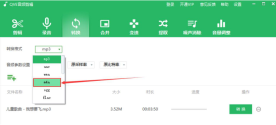 3.然后,在qve音频剪辑软件中,在转换格式处可以看到它默认的是MP3格式,而我们要选择的是“m4a”格式。