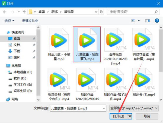 2.在弹出的窗口中,将需要转M4A的MP3音频选中,并点击“打开”按钮,将其导入qve音频剪辑软件。