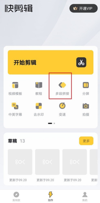 在手机中打开快剪辑,进入创作界面,点击【多段拼接】功能,