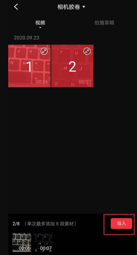 进入手机相册,选择需要合并的视频,单次最多添加8个素材,点击【导入】,