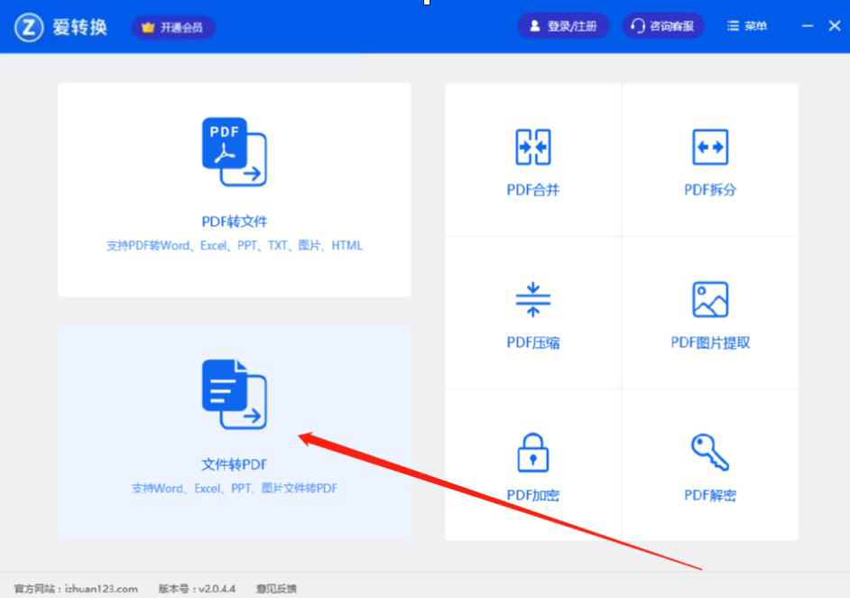 1、首先,我们打开爱转换PDF转换器,在其功能向导页面中,点击“文件转PDF”选项。