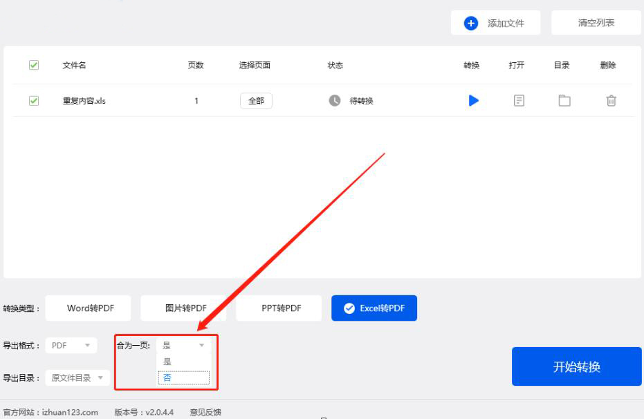 4、接下来,我们再根据自己的需要设置Excel转PDF后是否合为一页。