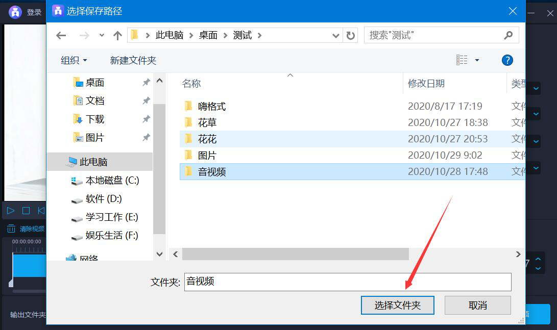 7、在弹出的窗口中,选中视频剪切后的输出文件夹,点击“选择文件夹”按钮。