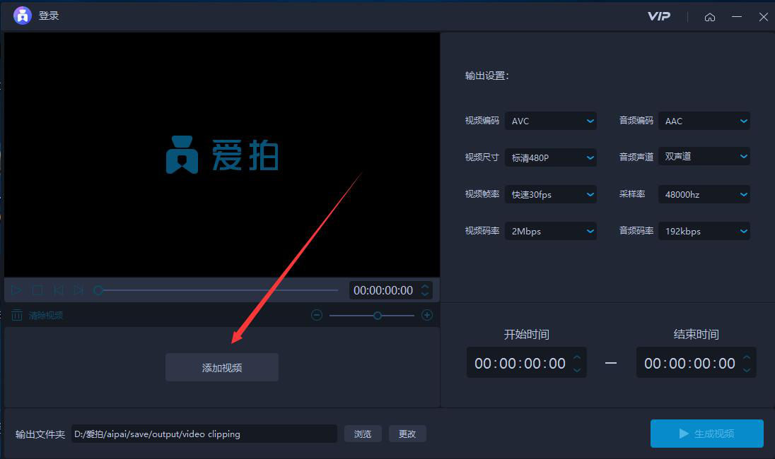 2、进入爱拍视频剪切操作界面后,点击“添加视频”按钮。