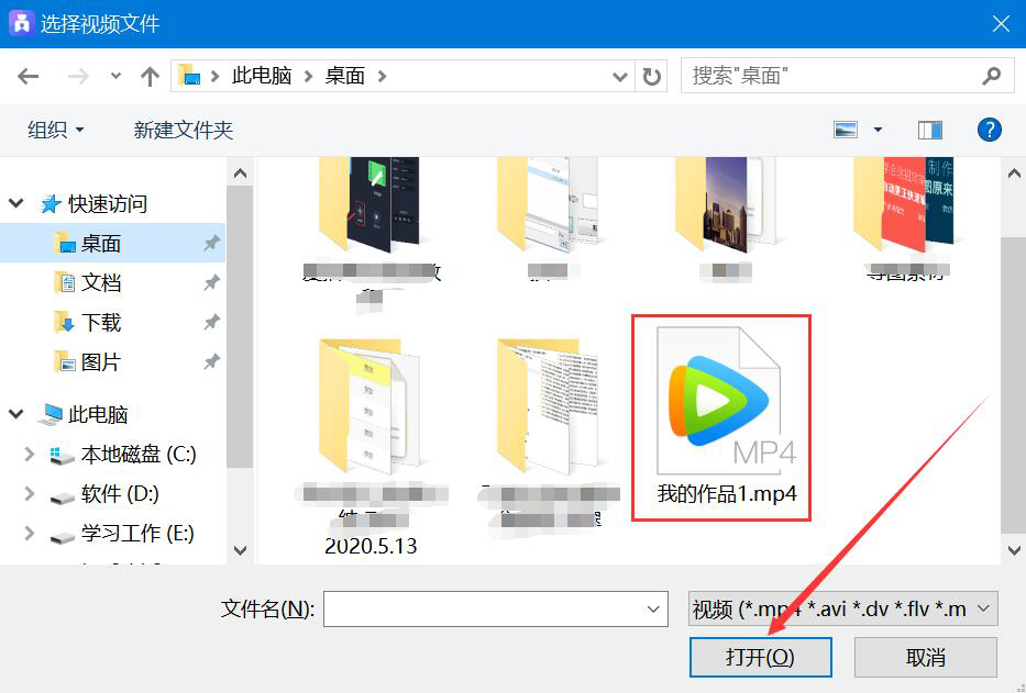 3、然后,从弹出的窗口中,将需要剪切的视频选中,点击“打开”按钮,将其导入爱拍。