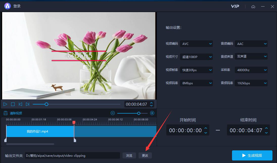 6、如果爱拍剪切的视频输出路径需要修改,就点击操作界面中的“更改”按钮。