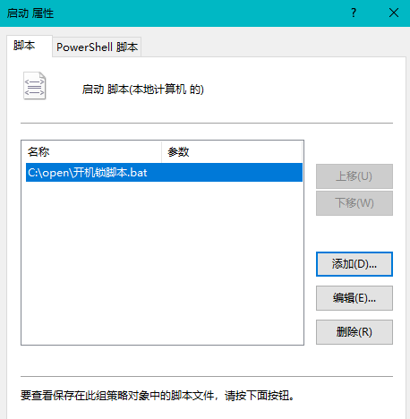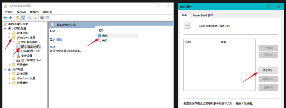 打开本地组策略编辑器,在左侧导航栏中依次点击【计算机配置】——【Windows设置】——【脚本(启动/关机)】,然后在右侧窗口点击【启动】选项,在属性面板中点击【添加】,