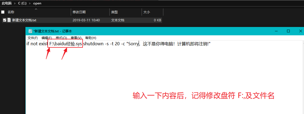 打开记事本文件,输入相关内容【if not exist F:\\baidu经验.sys shutdown -s -t 20 -c \"Sorry,这不是你的电脑,计算机即将注销!\"】,注意,记得修改盘符及文件名,