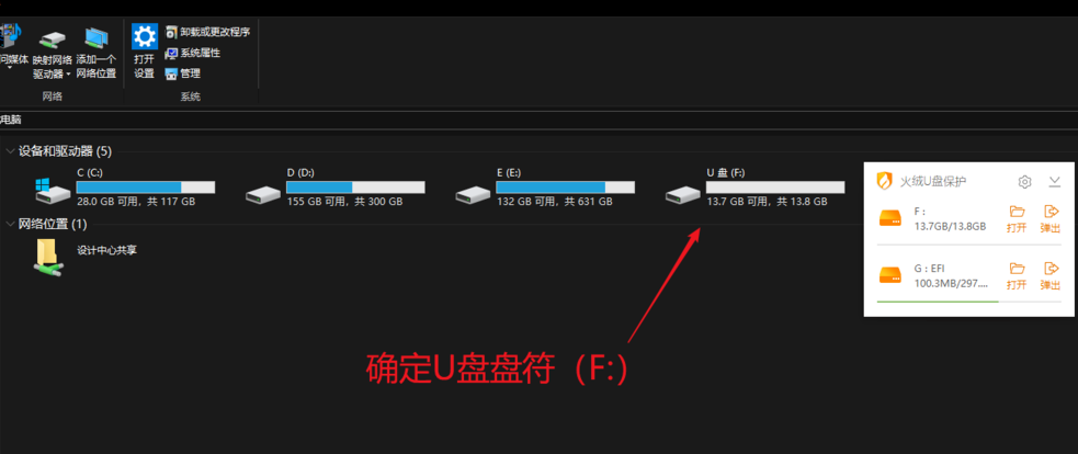 打开电脑,把U盘插入电脑,查看U盘盘符,
