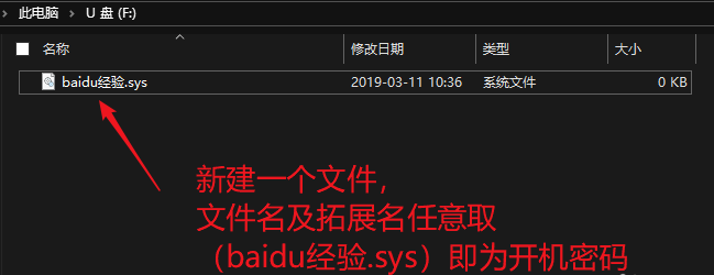 打开U盘,创建一个空白的文本文件,文件名和扩展名都可以随意取名,注意,文件名和拓展名即为开机钥匙,