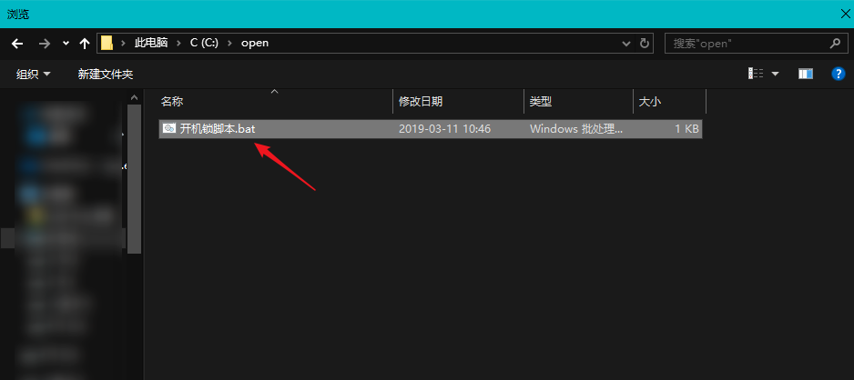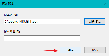 弹出添加脚本对话框,点击【浏览】,找到C盘目录下创建的\"开机锁脚本.bat\"文件,点击打开,