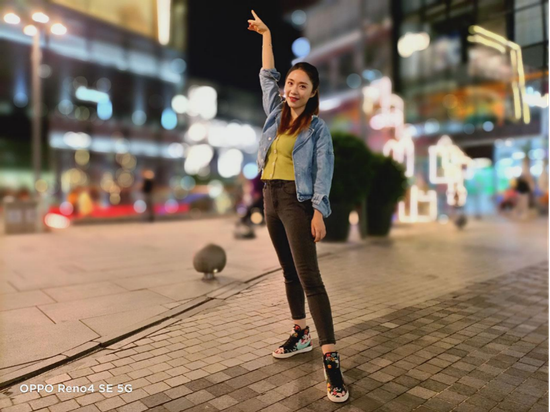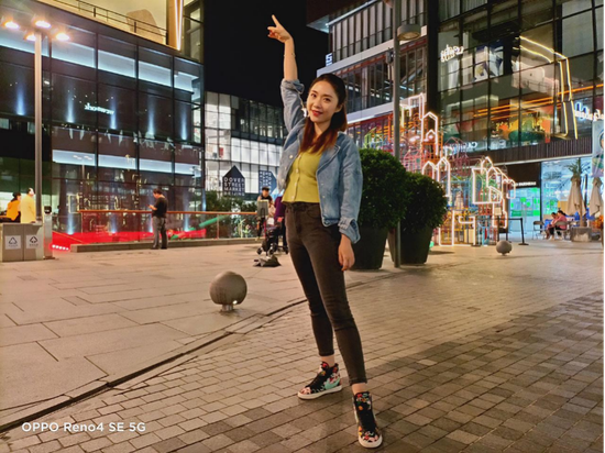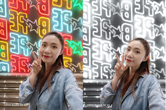 在人像的拍照上,OPPO Reno4 SE具有智能美颜效果,能够智能识别环境亮度、色温等信息,对人体肤质进行自然的优化效果。人像拍照功能则有两个十分有趣的功能,夜景光斑人像通过LowLight-HDR、光斑增强、虚化三重算法叠加,使作为背景的光线部分形成最佳的背景板。作为拍照主体的人本身,则能够精准识别形成鲜明的对比效果,突出人像本身。