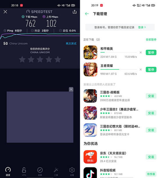 网络速度上我们更不用担心了,毕竟现在所有5G手机在理论速度支持上都是远超运营商套餐限速的。OPPO Reno4 SE在5G信号覆盖不错的环境中,测试速度轻松达到760Mbps下行/102Mbps上行。在实际的下载速度上表现同样出色,纯5G流量下载平均速度都能超过80MB/s,只要几十秒的时间即可下载完成《和平精英》这种大型游戏。