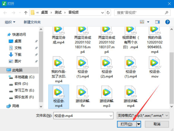 2.然后,在弹出的窗口中,将需要提取音频的视频文件选中,并点击“打开”按钮,将其导入qve音频剪辑。